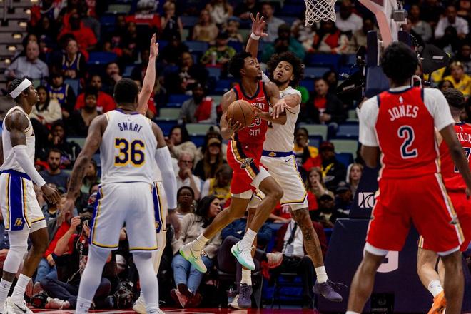 中场休息过后,第三节开局两队展开内线博弈,各得4分后,斯马特接东契奇传球完成空接得分,里夫斯随即命中三分,将分差扩大至14分。鹈鹕仍执着于冲击内线追分,八村垒则用三分、斯马特用中投回应,即便墨菲突破上篮将分差缩小至11分,湖人还是迅速开启“一波流”模式——东契奇串联、艾顿护框反击,球队多点开花打出11-0攻势,比分来到88-66。此后湖人始终掌控节奏,维持92-70的领先优势,期间阿尔瓦拉多与范德比尔特各命中一记三分,克内克特与东契奇因争议动作各吃一次技术犯规,鹈鹕罚中两球并完成暴扣追分,但湖人仍以30-25净胜5分,前三节战罢以95-77领先18分。