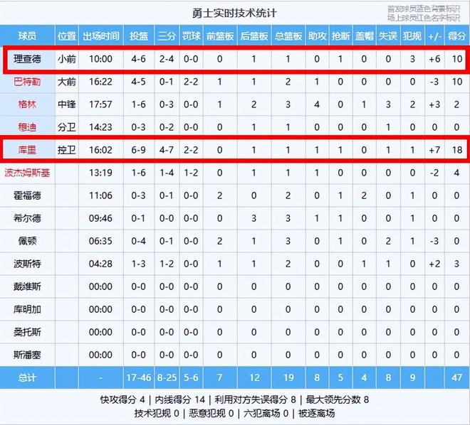 二号功臣(理查德):6中4得10分1篮板1抢断,正负值+6仅次于库里!勇士真捡到宝了,攻防两端简直就是升级版普尔,是勇士半场领先的二号功臣!