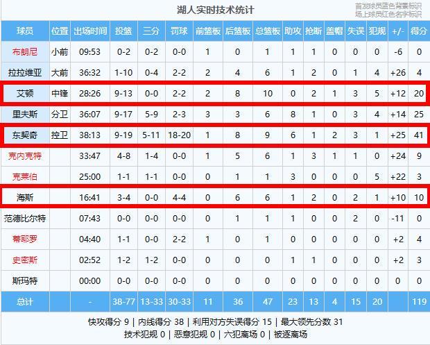 湖人:东契奇41分9板6助2帽、里夫斯25分6板8助、艾顿20分10板2断、海斯10分6板1助2断、克内克特9分6板1助3断、拉拉维亚4分6板1助2断、蒂耶罗4分1板、克莱伯3分1板3助