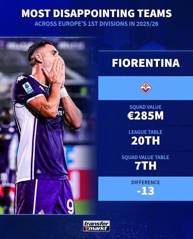 北京时间11月7日,德转盘点了本赛季至今欧洲主流联赛中发挥最令人失望的8支球队,佛罗伦萨、诺丁汉森林、纽卡斯尔联以及毕尔巴鄂竞技上榜。
